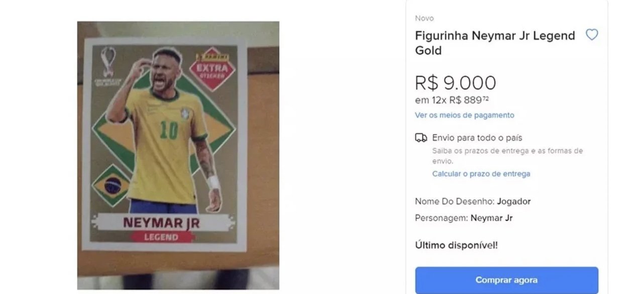 Com preço sugerido de até R$ 9 mil em um site de compra e venda na internet, a figurinha dourada do tipo Legends (lendas, em inglês) de Neymar, ex-jogador do Santos e que atualmente atua pelo PSG (França), virou uma espécie de "Santo Graal" dos colecionadores do álbum da Copa do Mundo do Catar, lançado na última sexta-feira (19). As informações são do Portal g1/SP.