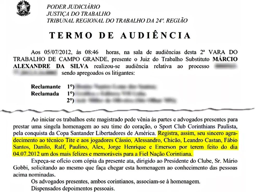 Com a aprovação dos advogados presentes, ele registrou: “Seu sincero agradecimento ao técnico Tite e aos jogadores Cássio, Alessandro, Chicão, Leandro Castan, Fábio Santos, Danilo, Ralf, Paulino, Alex, Jorge Henrique e Emerson por terem feito do dia 04.07.2012 um dos mais felizes e memoráveis para a Fiel Nação Corintiana”.