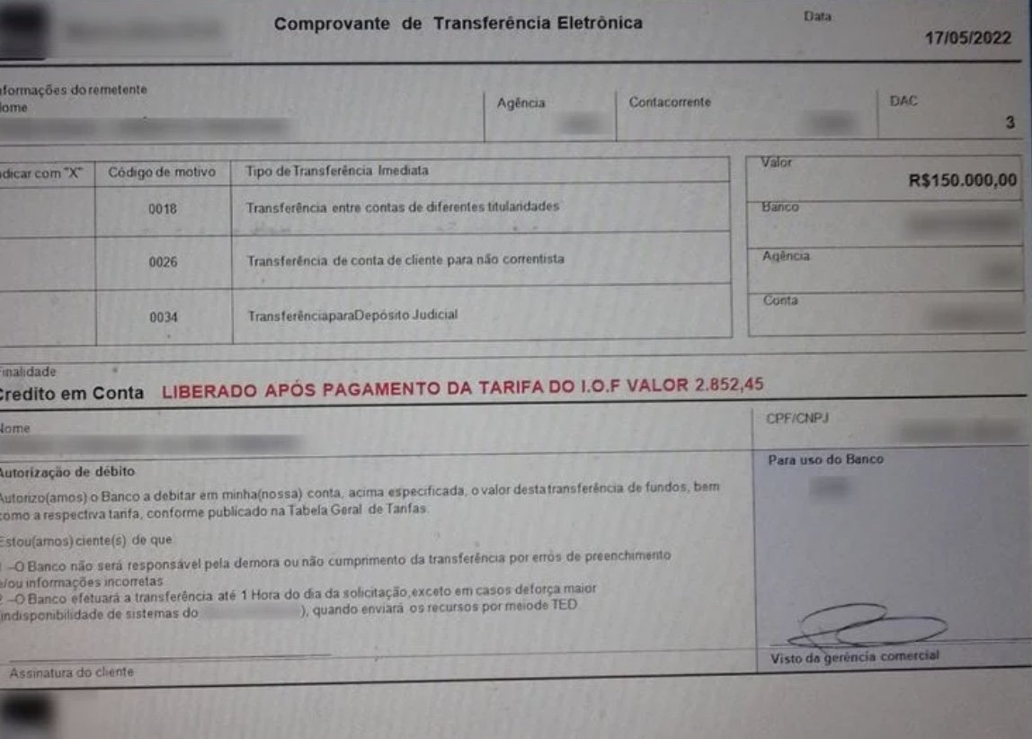 Segundo o Fisco, os fraudadores fornecem documentos falsos de notificação e de arrecadação que induzem o cidadão a recolher taxas inexistentes para a liberação do dinheiro. A vítima repassa o suposto IOF por meio de transferências Pix para pessoas físicas.