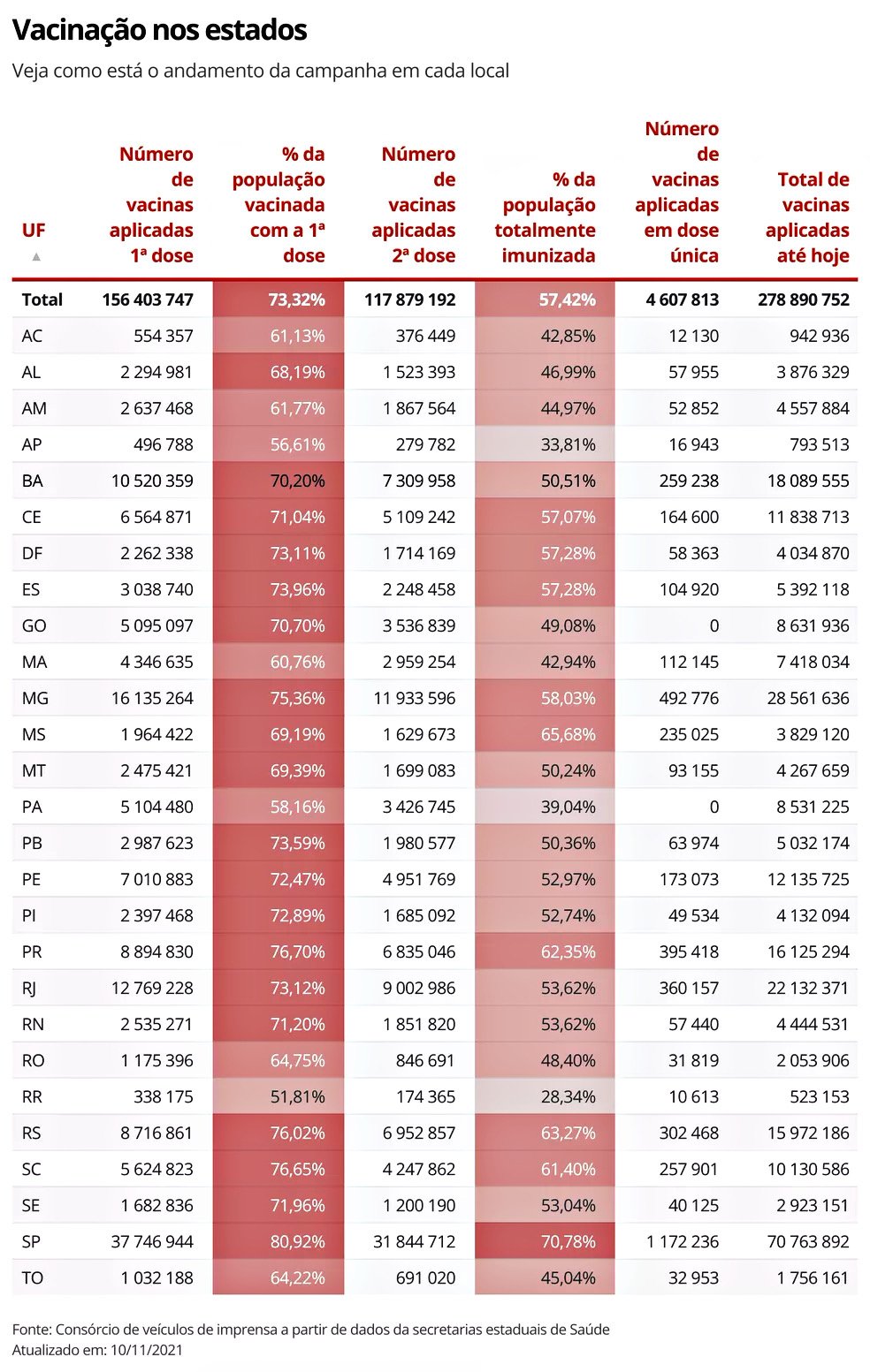 Já entre aqueles que mais tem sua população parcialmente imunizada estão São Paulo (80,92%), Paraná (76,70%), Santa Catarina (76,65%), Rio Grande do Sul (76,02%) e Minas Gerais (75,36%).