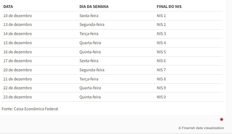 Na segunda-feira (13) será a vez de quem tem NIS terminado em 2, e assim por diante. O pagamento do mês de dezembro será concluído para beneficiários com NIS final zero, no dia 23 de dezembro, conforme o calendário previamente divulgado. Confira as datas:
