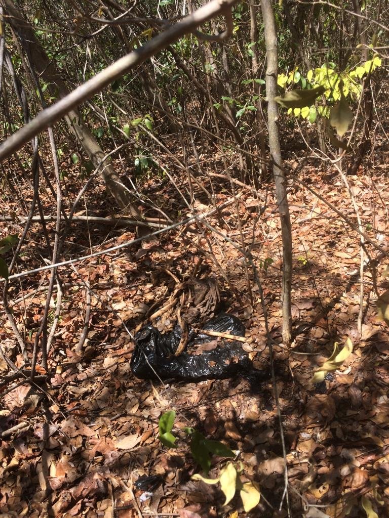 A ossada foi encontrada por moradores locais em uma área de mata e havia algumas partes fora do saco. Em seguida, a polícia foi acionada e se deslocou até o local indicado.
