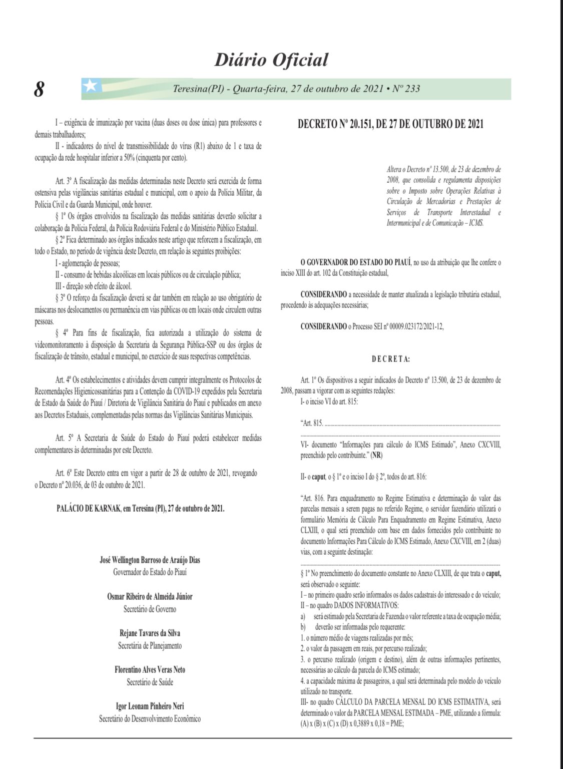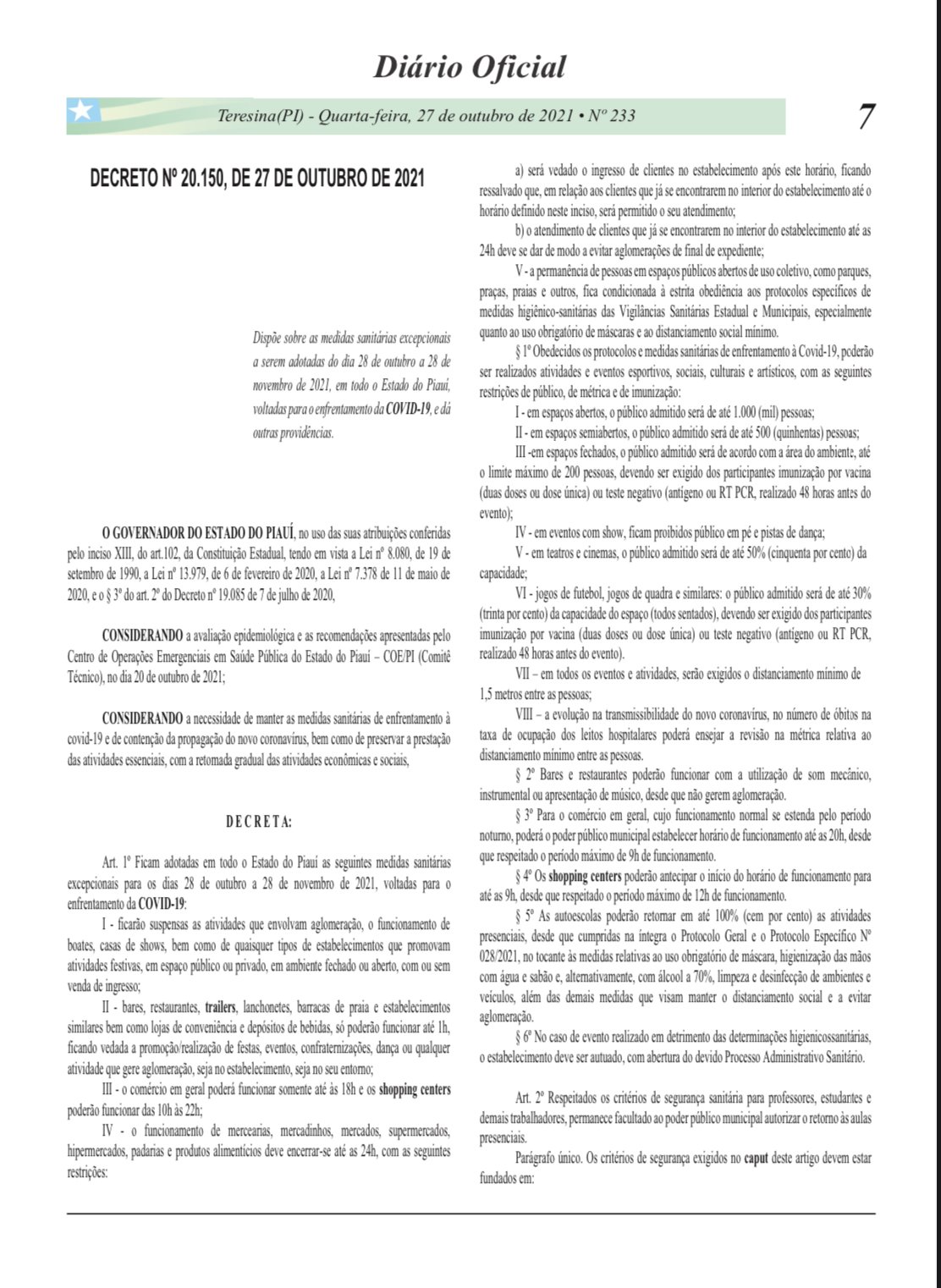 O governador Wellington Dias (PT), assinou decreto em que que libera eventos para públicos de até 1.000 pessoas em ambientes abertos. O documento foi publicado nessa quarta-feira (27/10), no Diário Oficial do Estado do Piauí.