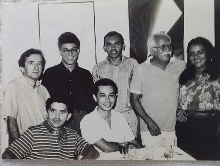 Fábio Teles, aniversariante desse domingo,13, ladeado pelos saudosos cronistas, Mauro Júnior, Nelito Marques e Paulo José. Além dos jornalistas Alice Moreira (atualmente no Cerimonial do Palácio de Karnak), Francisco Moura e este cronista, em evento social na década de 1980.