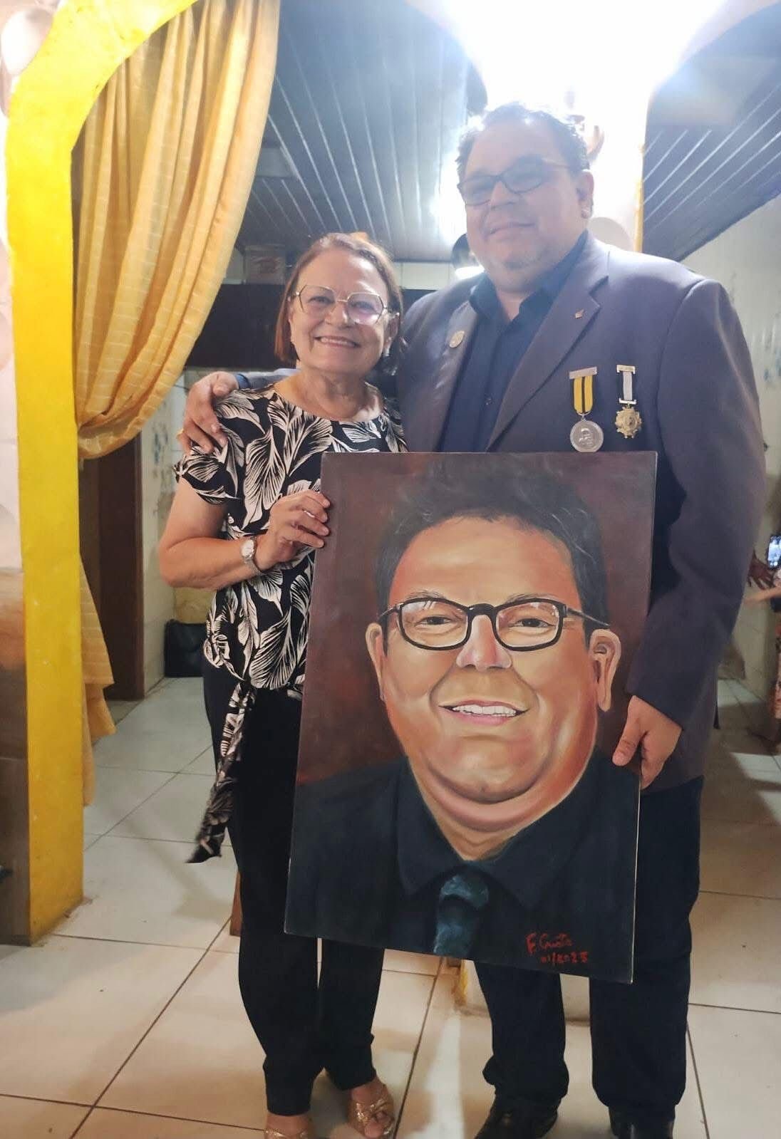 O “Intelectual do Ano”, imortal e professor Dr. Estélio Silva Barbosa, foi homenageado com um auto retrato, pintado pelo artista plástico, Fabiano de Cristo. O evento foi bastante prestigiado. Na foto, o homenageado ladeado de Leonor Palha Dias