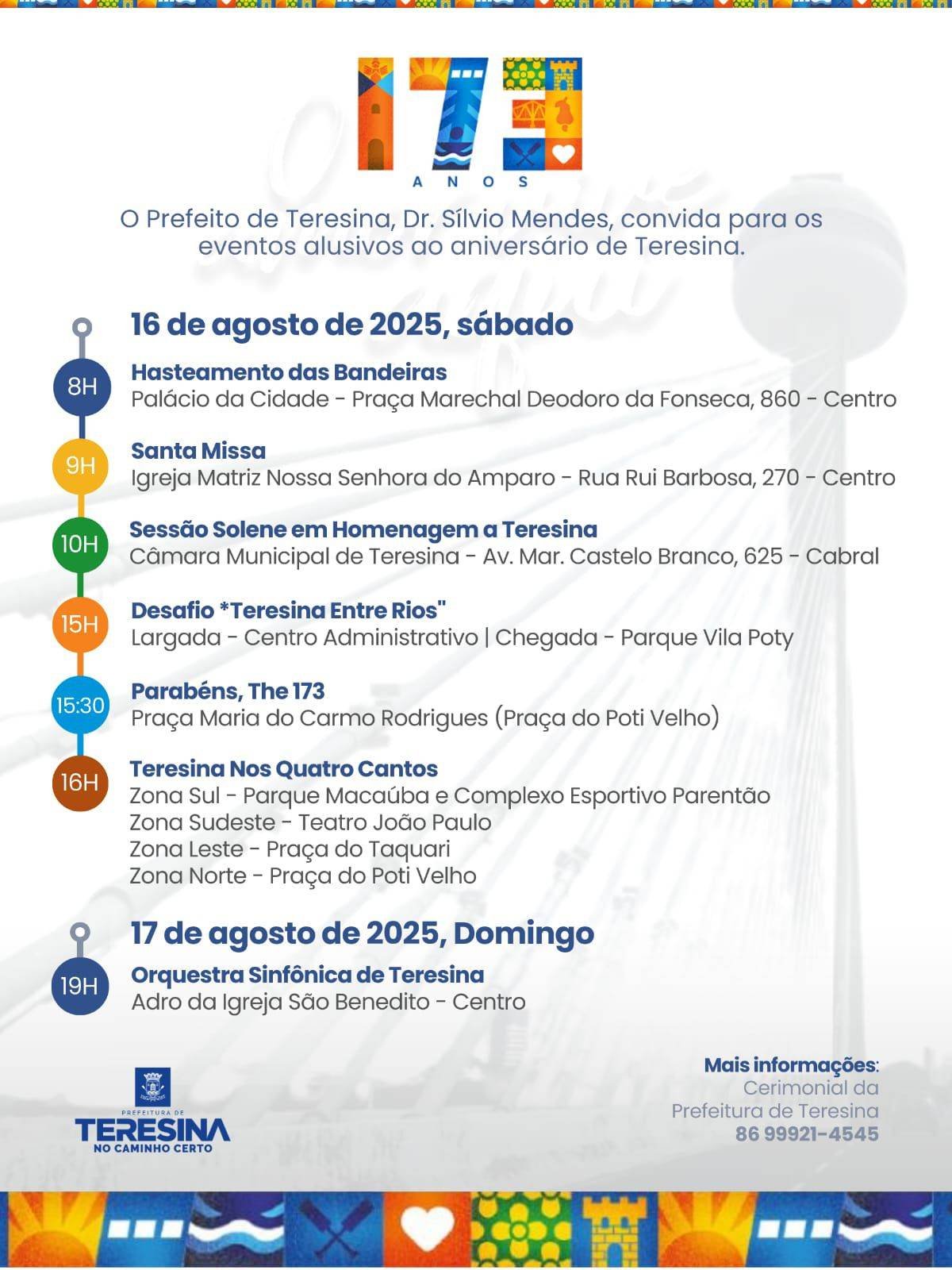 Em alusão à data, a Prefeitura de Teresina divulga as atividades que acontecerão nos dias 16 e 17 de agosto. Dentro das celebrações religiosas e culturais, o evento contará com o tradicional hasteamento das bandeiras, missa em ação de graças, sessão solene na Câmara Municipal e o tradicional corte do bolo.