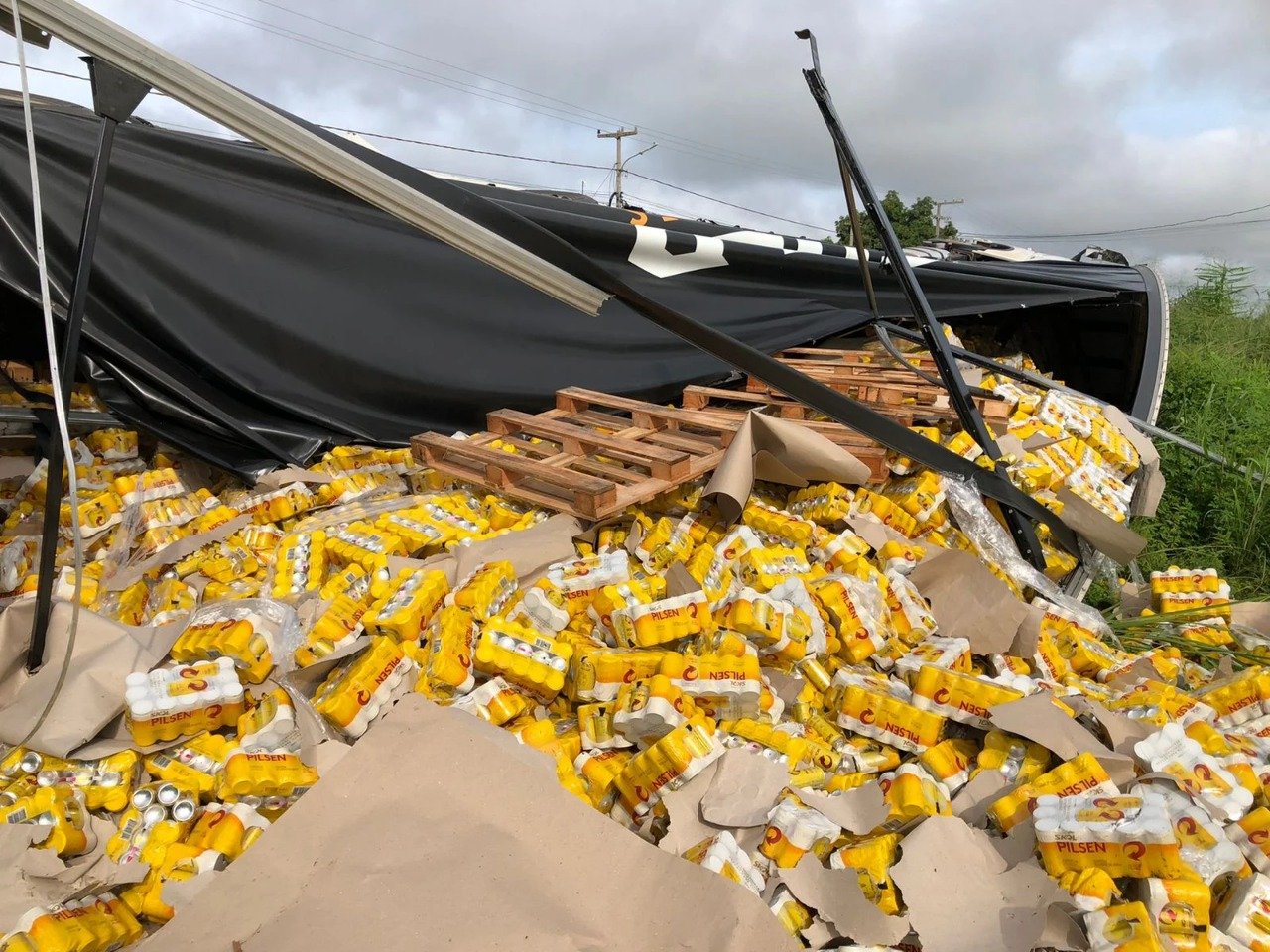 A carreta tombou na frente de uma distribuidora de bebidas. Funcionários da empresa estão no local para evitar saques por parte de populares que estão no local. O trânsito não teve seu fluxo afetado e local ficou aos cuidados da Polícia Rodoviária Federal.