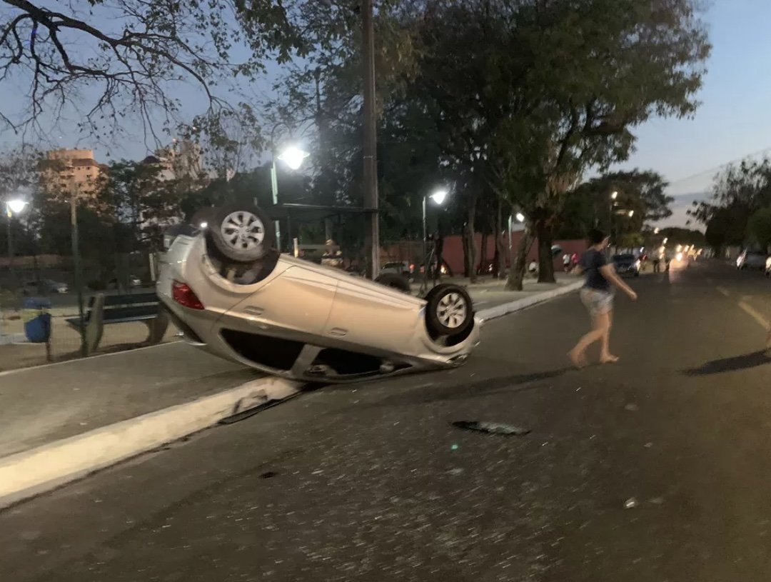 Segundo testemunhas, o motorista do carro de passeio teria invadido a preferencial, bateu em outro veículo e no meio-fio, e acabou capotando.