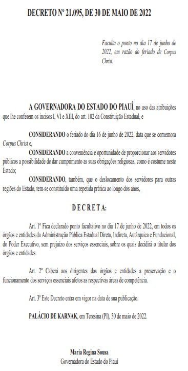 A Governadora Regina Sousa (PT) estabeleceu ponto facultativo para o dia 17 de junho, um dia após o feriado de Corpus Christi, em todos os órgãos e entidades da Administração Pública Estadual Direta, Indireta, Autárquica e Fundacional do Estado do Piauí. O decreto foi publicado na edição de ontem (30) do Diário Oficial do Estado.