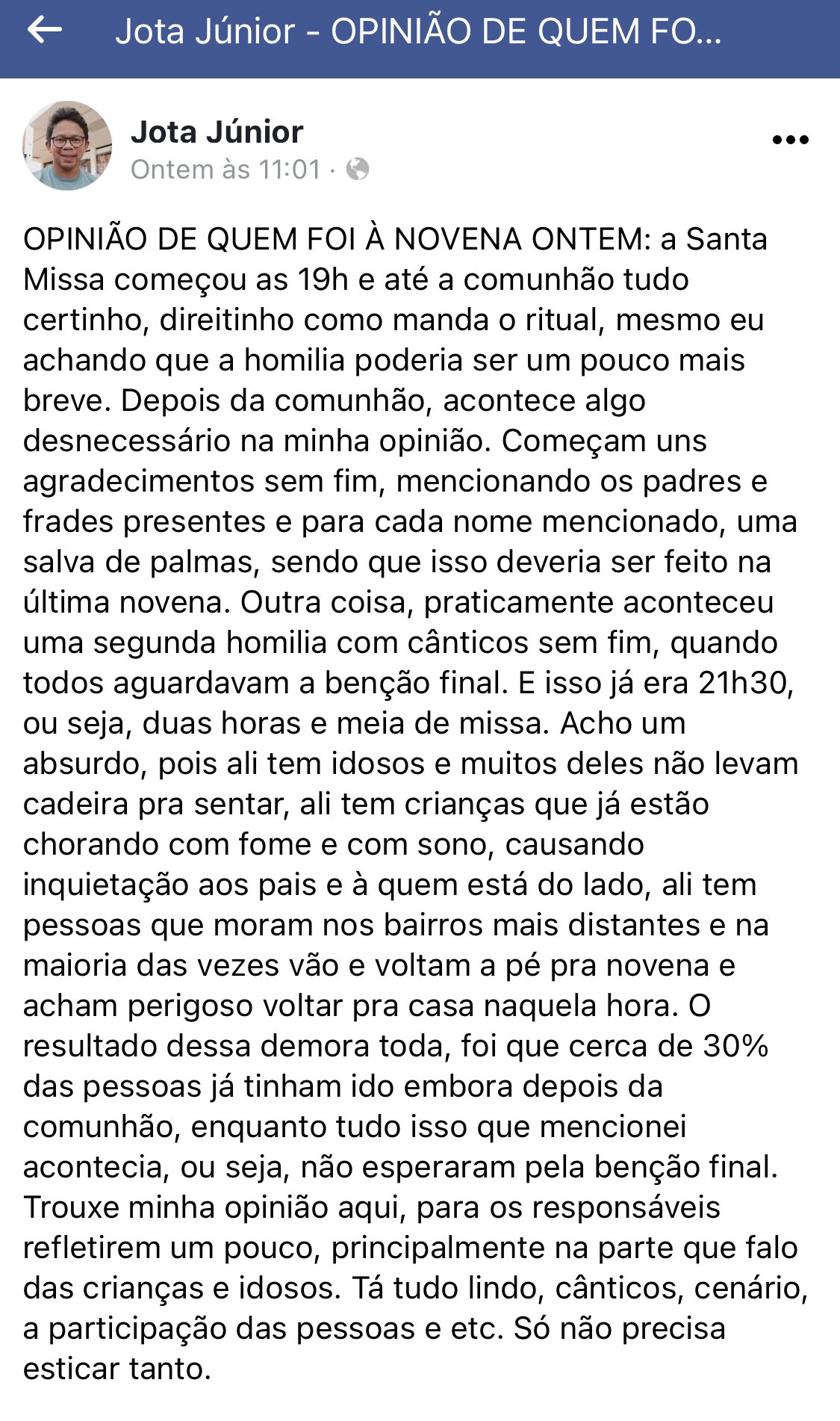 Em uma publicação mas redes sociais, o jornalista disse: "a Santa Missa começou às 19h e até a comunhão tudo certinho, como manda o ritual, mesmo achando que a homilia poderia ser um pouco mais breve. Depois da comunhão, acontece algo desnecessário na minha opinião. Começam uns agradecimentos sem fim, mencionando padres e frades presentes e para cada nome mencionado, uma salva de palmas, sendo que isso deveria ser feito na última novena [...]".