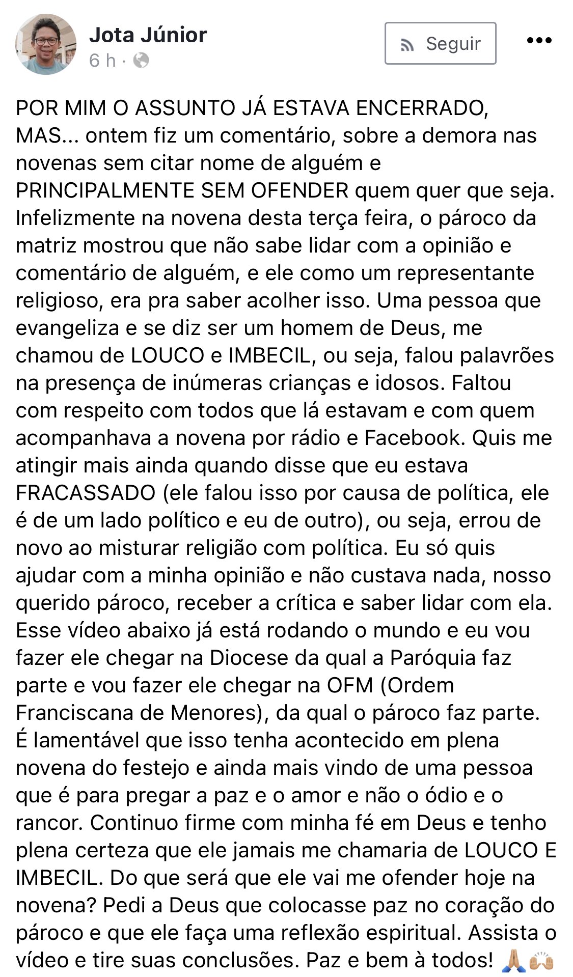 O fato, foi motivo de comentários do próprio pároco, no dia seguinte (12 de outubro). Em uma parte do novenário, ele disparou: "[...] Seu orgulho besta, ciúme, inveja de quem trabalha, de quem ama a igreja, de quem zela. Tem um louco aí, um imbecil, que no face dele, criticando, o trabalho dos nossos jovens, a segurança a organização. Um imbecil que se coloca como jornalista, mas não é jornalista, porque não contribui com o crescimento cultural de si e da sociedade, não sabe nem se comunicar, então precisa melhorar, mais ainda, e quer se fazer pela mídia, se apresentar pela mídia e quer buscar pela mídia vantagem, vai perder, vai perder e feio, porque o poder de Deus é maior".