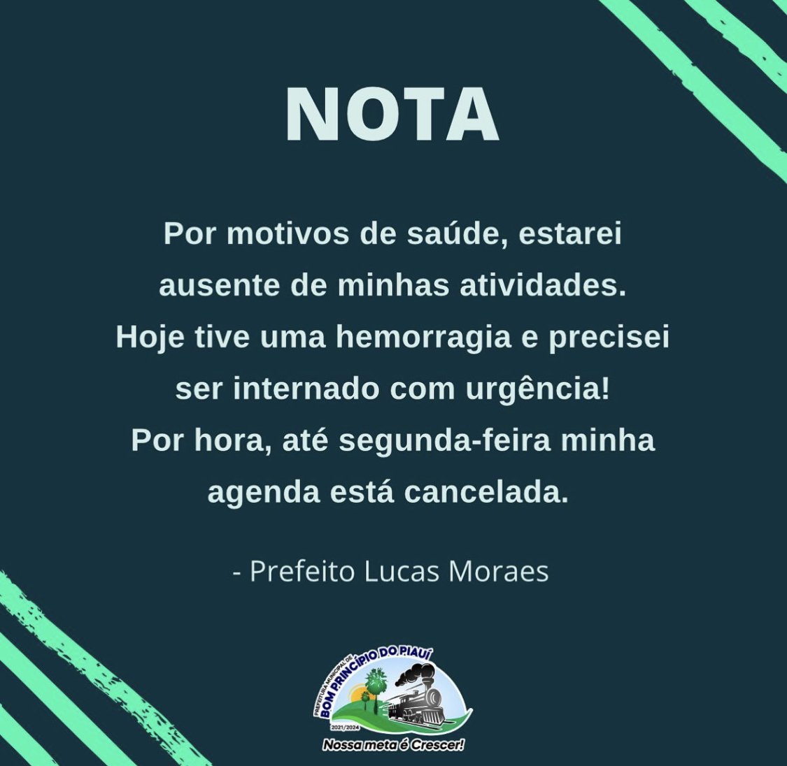 O prefeito da cidade de Bom Princípio do Piauí, Lucas Moraes, foi hospitalizado após sofrer uma hemorragia torácica. Na noite de terça-feira (02/11), o gestor foi encaminhado para o Hospital Estadual Dirceu Arcoverde (HEDA), em Parnaíba, mas nesta quarta-feira (03/11), foi transferido para um hospital particular de Teresina.
