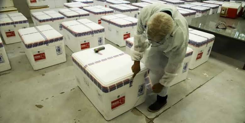 Os lotes da vacina Covid-19 que chegam ao Piauí são recebidas no aeroporto pela equipe do Centro de Distribuição Logístico da Sesapi, que armazena os imunizantes em câmaras frias. Esse time é o responsável por realizar a contagem e separação das doses de acordo com estimativas populacionais definidos pelo Plano Nacional de Operacionalização da Vacinação Contra a Covid-19 (PNO) e com base no quantitativo de doses disponibilizadas pelos laboratórios que fabricam os imunizantes a cada semana.