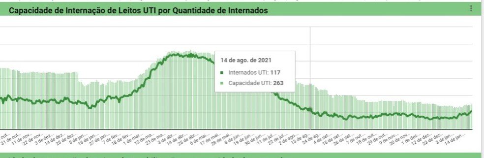Atualmente, segundo levantamento da Secretaria de Estado da Saúde, o estado tem 110 internados em UTIs Covid. Em 14 de agosto de 2021, eram 117 internados.