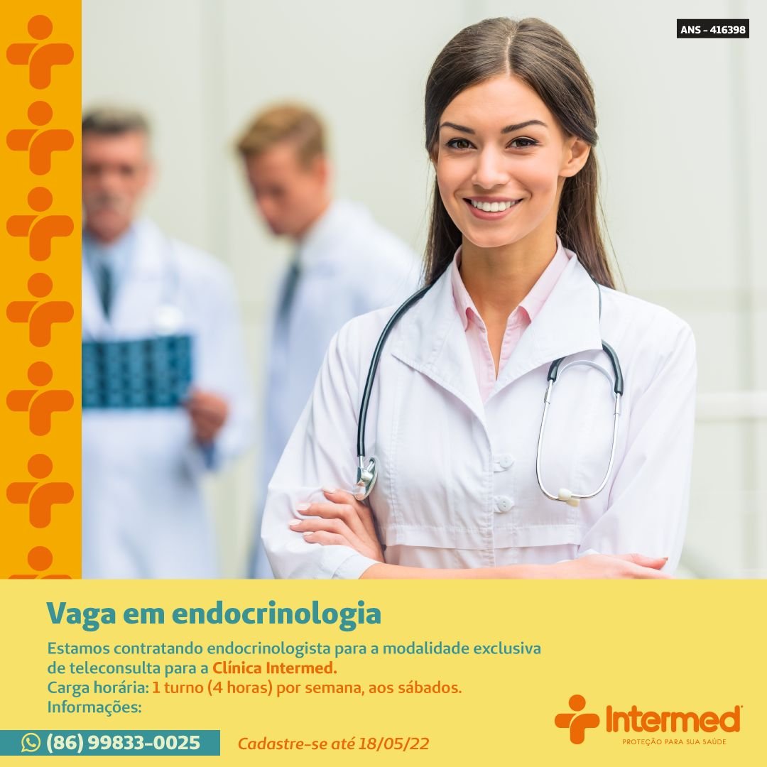 A Intermed, plano de saúde do Sistema Unimed Teresina, está com vaga disponível para médico especialista em endocrinologia. O prazo das inscrições é até o dia 18 de maio (03 dias úteis a contar da publicação).