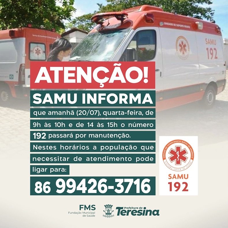 A Fundação Municipal de Saúde (FMS) informou que a linha 192 do Serviço de Atendimento Móvel de Urgência (SAMU) estará fora do ar em dois horários específicos devido à manutenção, nesta quarta-feira (20).