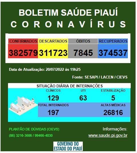 Dos leitos existentes na rede de saúde do Piauí para atendimento à Covid-19, 197 estão ocupados, sendo 129 leitos clínicos, 63 UTI’s e 05 leitos de estabilização. As altas acumuladas somam 26.816 até o dia 20 de julho de 2022.