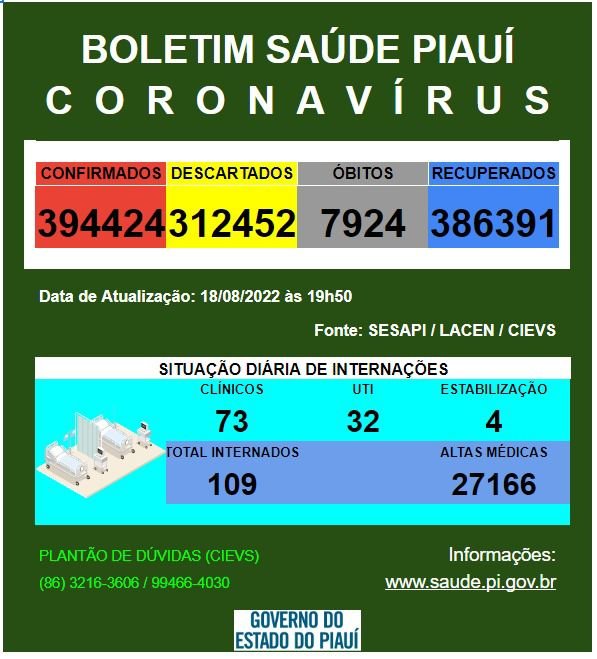 No estado, os casos confirmados somam 394.424 em todos os municípios piauienses. Já os óbitos pelo novo coronavírus chegam a 7.924 casos e foram registrados em 224 municípios.