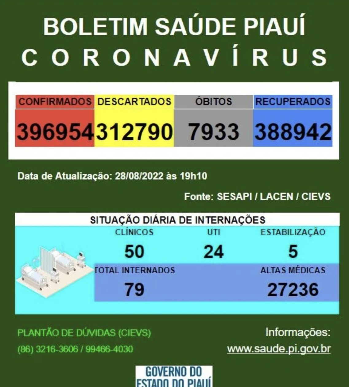 Dos leitos existentes na rede de saúde do Piauí para atendimento à Covid-19, 79 estão ocupados, sendo 50 leitos clínicos e 24 UTI’s e 05 leitos de estabilização. As altas acumuladas somam 27.236 até o dia 28 de agosto de 2022.
