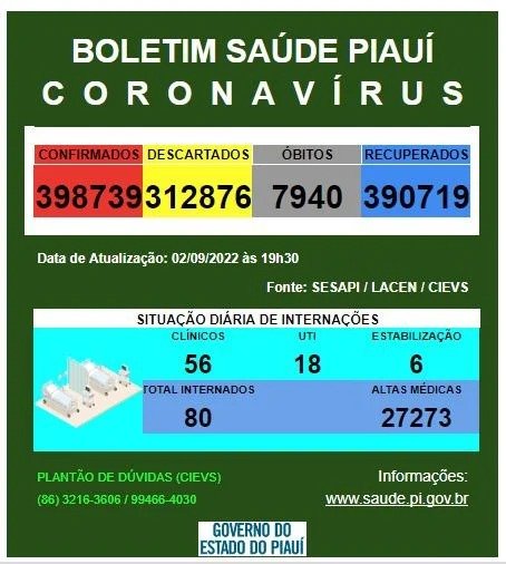 No estado, os casos confirmados somam 398.739 em todos os municípios piauienses. Já os óbitos pelo novo coronavírus chegam a 7.940 casos e foram registrados em 224 municípios.