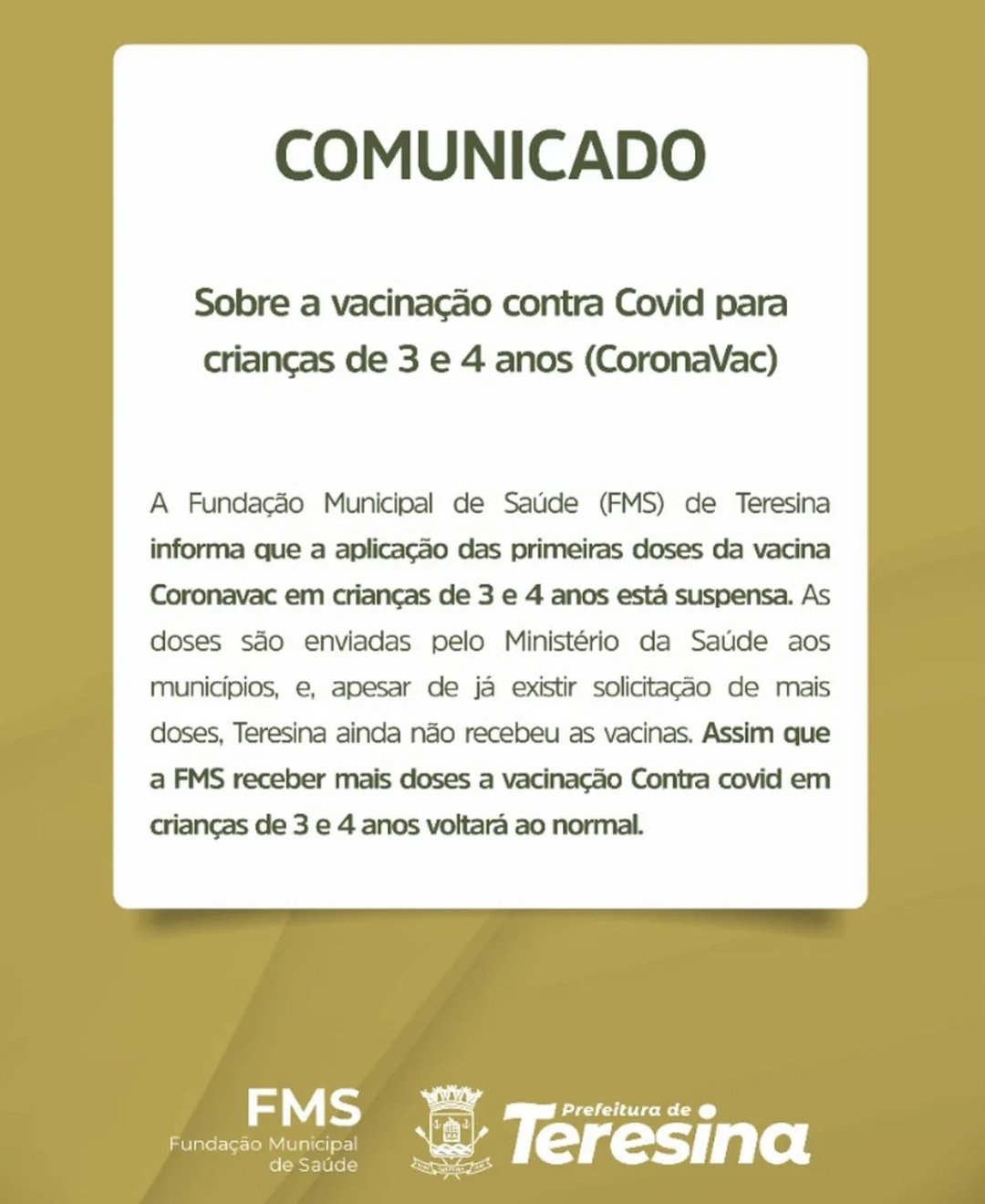 O órgão também informou que já existe uma solicitação de novas vacinas para Teresina. Assim que a FMS receber as doses solicitadas, a vacinação contra Covid-19 em crianças de 3 e 4 anos será normalizada, mas ainda está sem previsão de retorno.