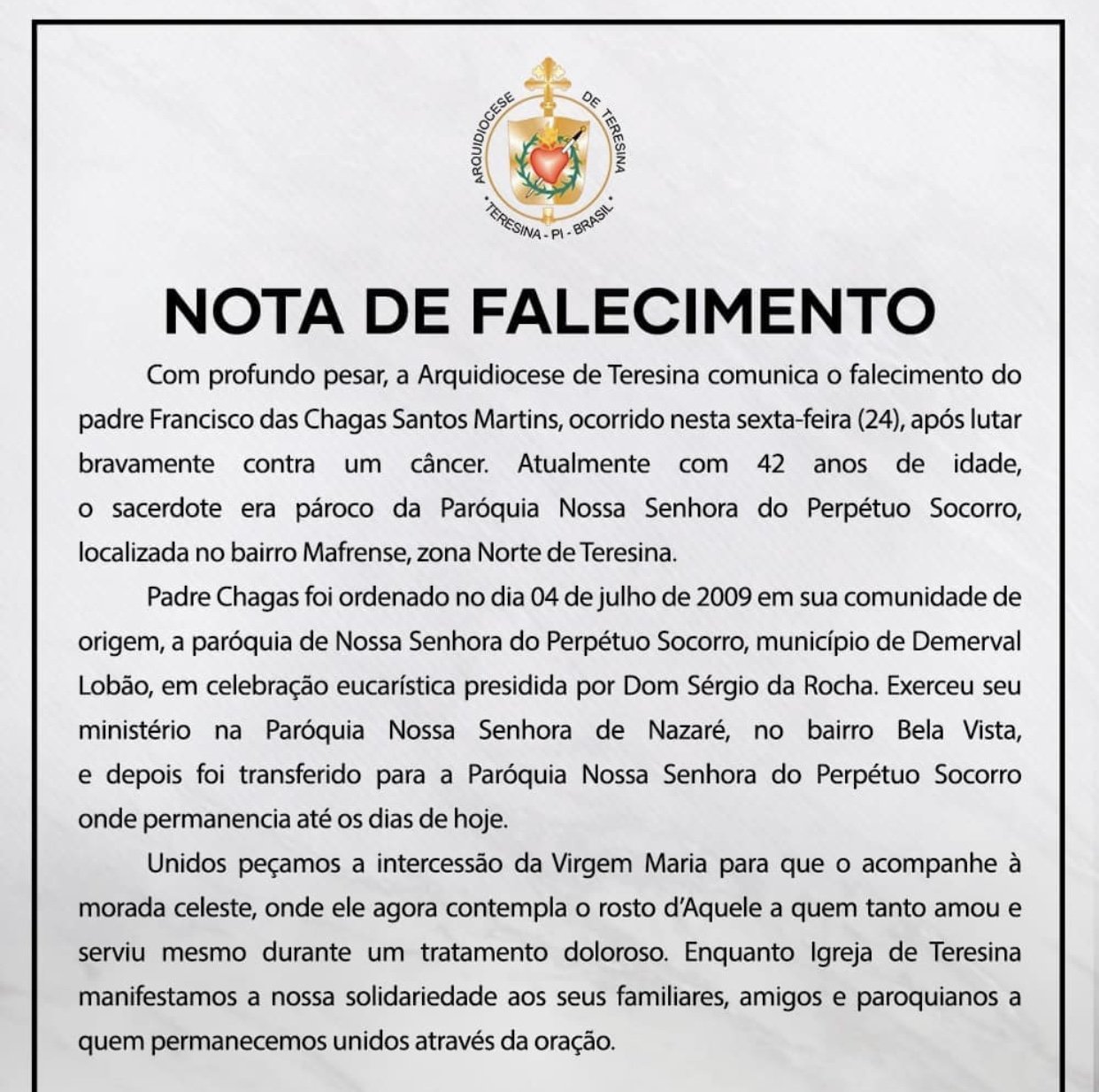 Nesta sexta-feira(24), o padre Francisco das Chagas Santos Martins morreu aos 42 anos, vítima de câncer, na cidade de Teresina. O sacerdote era pároco da Paróquia Nossa Senhora de Perpétuo Socorro, localizado no bairro Mafrense, zona norte da Capital.