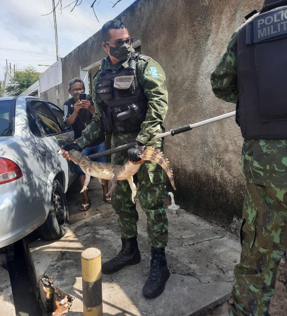 O Batalhão da Polícia Ambiental resgatou um jacaré na manhã deste sábado (5) no bairro Mocambinho I, Zona Norte de Teresina. O animal estava debaixo de um carro e teria sido arrastado de uma lagoa da região durante a forte chuva na noite de sexta-feira (4).
