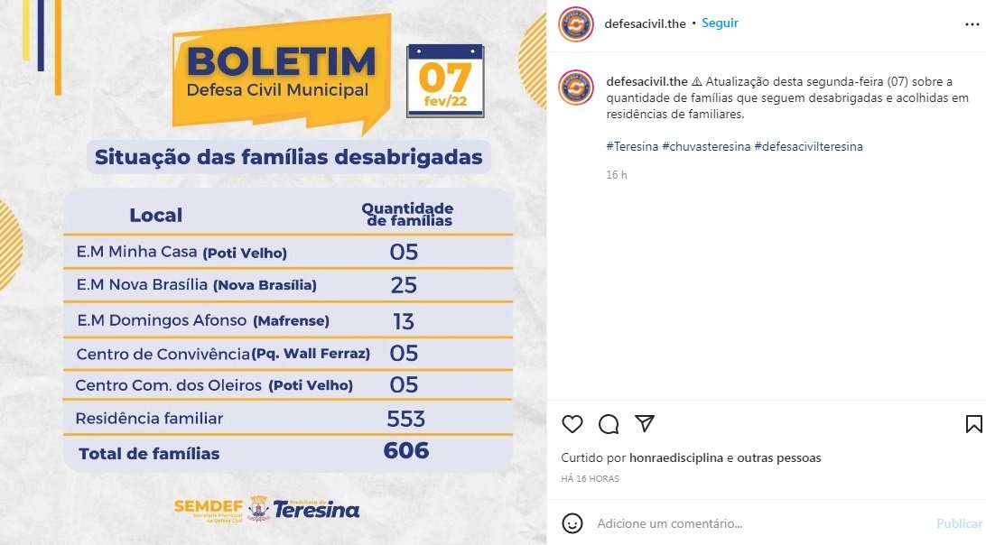 Confira a publicação na rede social da Defesa Civil Municipal de Teresina: