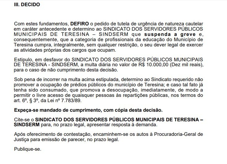 Além disso, o magistrado também estipulou multa diária de R$ 10 mil para o Sindicato dos Servidores Municipais de Teresina (Sindserm), caso haja descumprimento da ordem. O juiz determina ainda que os professores retornem imediatamente as salas de aulas e proíbe o Sindicato de realizar ocupações em prédios públicos. Os professores estão há 60 dias em greve.