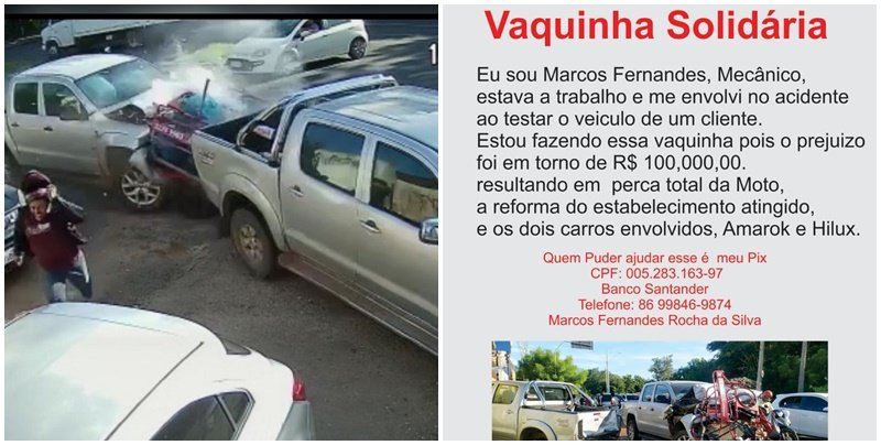 O mecânico Marcos Fernandes Rocha da Silva, que se envolveu, acidentalmente, na colisão de veículos enquanto trabalhava, na Avenida Maranhão, na última quinta-feira (12), começa a receber ajuda de vaquinha online. Ele conduzia carro Amarok que colidiu em outros dois veículos, que em seguida atingiram uma loja de construções. O prejuízo chega a R$100 mil.