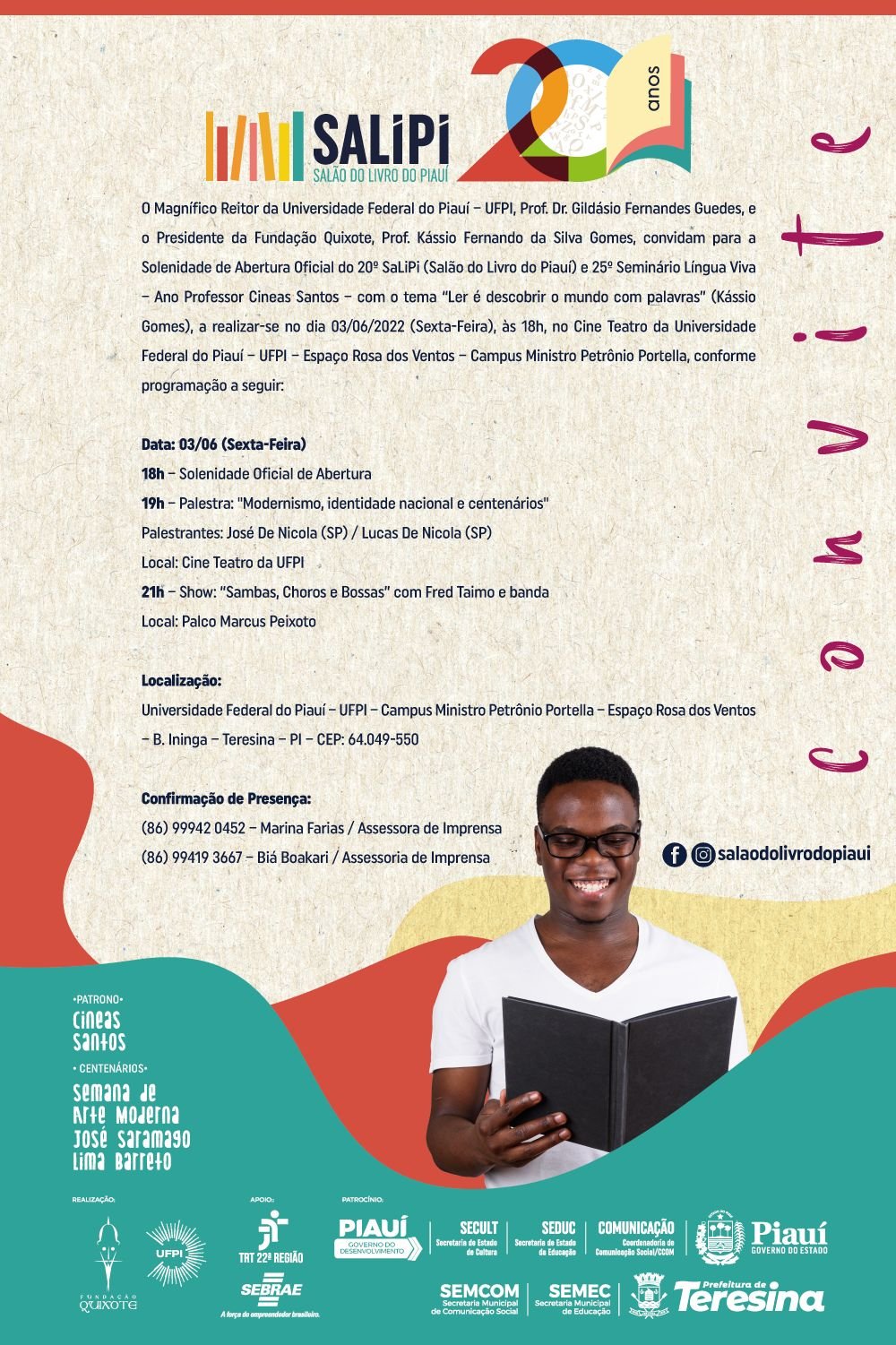 A solenidade de abertura oficial do 20º Salipi e do 25º Seminário Língua Viva – Ano Professor Cineas Santos – com o tema “Ler é descobrir o mundo com palavras”, será realizada às 18h desta sexta-feira (03), no Cine Teatro da UFPI, Espaço Rosa dos Ventos. Contará com a palestra "Modernismo, identidade nacional e centenários", ministrada por José De Nicola (SP) e Lucas De Nicola (SP) e com o show "Sambas, Choros e Bossa" com Fred Taimo e banda, no palco Marcos Peixoto.