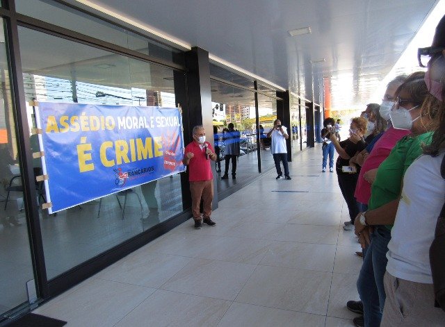 Com faixas que lembram que assédio sexual e moral é crime, os economiários convocavam os colegas a denunciar qualquer forma de abuso. O sindicato dos bancários distribuiu panfletos com orientações sobre prevenção e enfrentamento ao assédio.