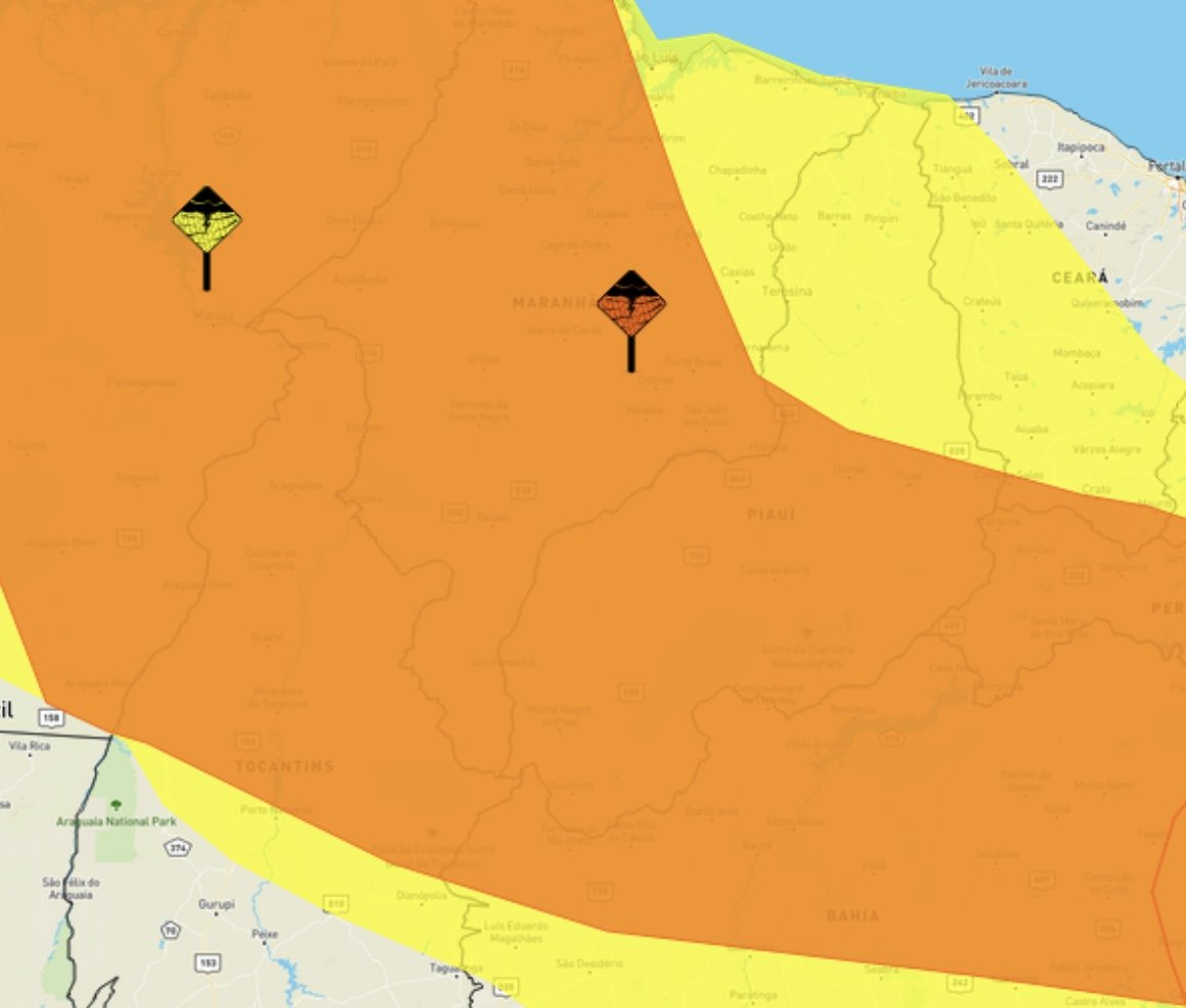 Já para os municípios situados nas regiões Sudeste, Sudoeste e parte do Centro-Norte, a exemplo de Picos, Uruçuí e Corrente, o INMET emitiu aviso de Perigo, alertando para chuvas torrenciais que devem chegar a até 100 mm/dia, além de ventos intensos que podem chegar até a 100 km/h.
