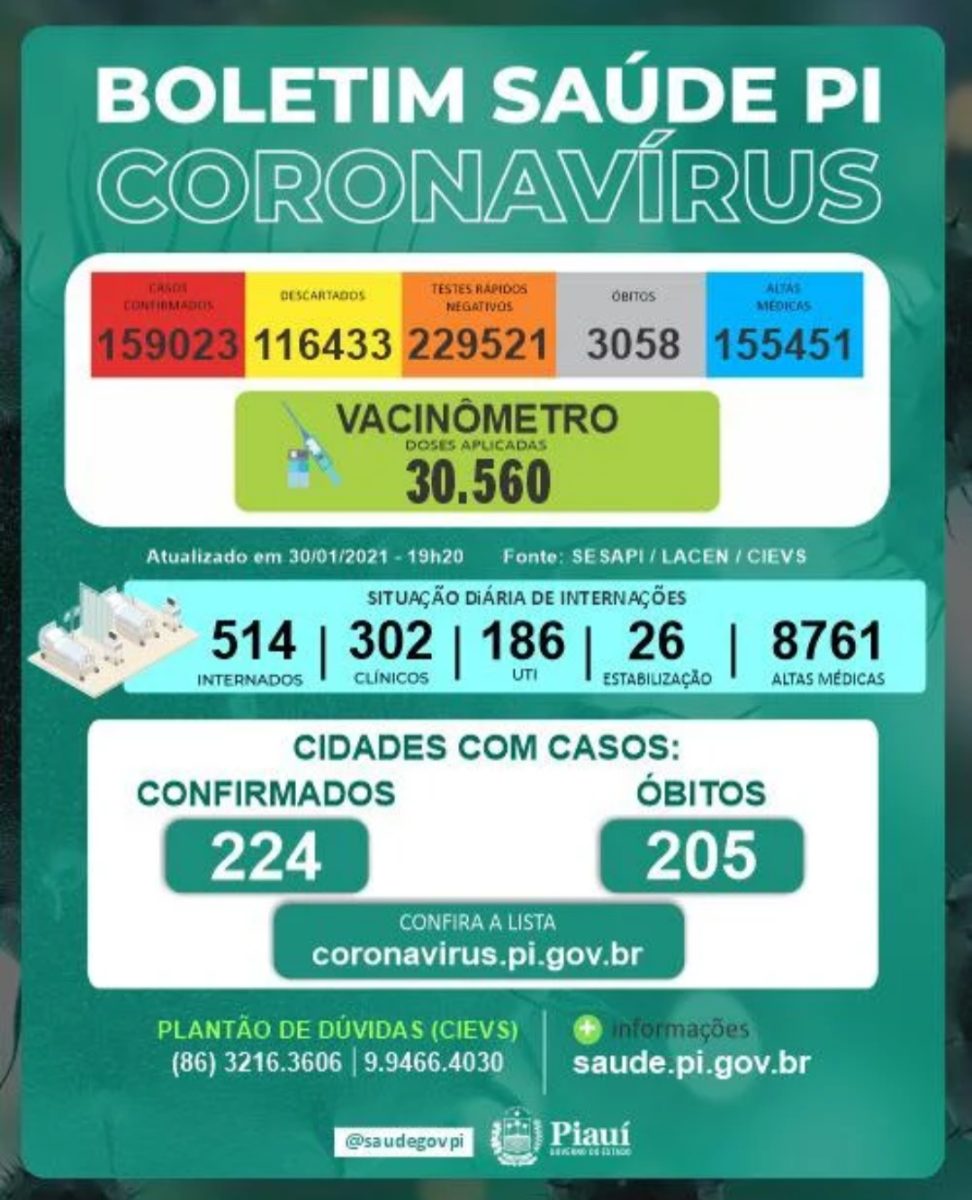Os casos confirmados no estado somam 159.023 distribuídos em todos os municípios piauienses. Já os óbitos pelo novo coronavírus chegam a 3.058 e foram registrados em 205 municípios. Até agora, morreram 1.789 homens e 1.269 mulheres.