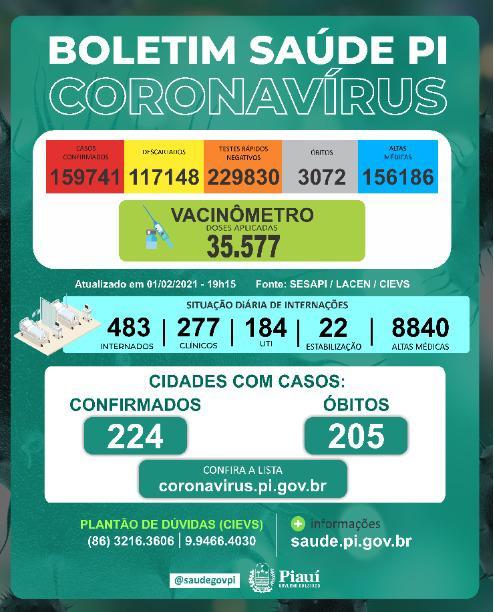 Os casos confirmados no estado somam 159.741 distribuídos em todos os municípios piauienses. Já os óbitos pelo novo coronavírus chegam a 3.072 e foram registrados em 205 municípios. Até agora, morreram 1.796 homens e 1.276 mulheres.
