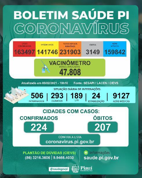 Os casos confirmados no estado somam 163.497 distribuídos em todos os municípios piauienses. Já os óbitos pelo novo coronavírus chegam a 3.149 e foram registrados em 207 municípios. Até agora, morreram 1.846 homens e 1.303 mulheres.