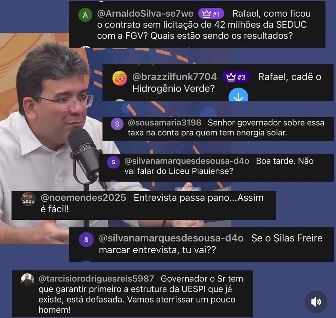 O governador do Piauí, Rafael Fonteles, segue seu ciclo de entrevistas neste mês de abril, passando por veículos considerados próximos ao seu grupo político. Entre eles, o portal Conecta Piauí e a TV Antena 10. As entrevistas tiveram um tom mais leve, sem entrar em temas que hoje estão no centro do debate público, como a crise na educação, os protestos de estudantes, projetos anunciados na área de tecnologia e outras cobranças da população. Mas o que chamou atenção veio depois: a reação nas redes sociais. No caso do Conecta, usuários relataram dificuldade em visualizar comentários críticos, levantando questionamentos sobre moderação de conteúdo. Já nos canais ligados à Antena 10, apesar de algum controle, permaneceram centenas de comentários muitos deles com críticas ao governo. Durante as transmissões ao vivo, também apareceram manifestações de insatisfação, incluindo pedidos para que o governador participe de entrevistas em veículos considerados mais independentes. Esse termômetro das redes sociais acaba refletindo um ambiente de maior cobrança por parte da população. E é justamente esse clima que entra no debate quando se fala em pesquisas de opinião divulgadas no estado, frequentemente contestadas por parte do eleitorado. O fato é que, entre entrevistas controladas e reação espontânea nas redes, encontra-se um cenário de contraste: de um lado, o discurso institucional; do outro, a resposta direta de quem comenta, critica e cobra.