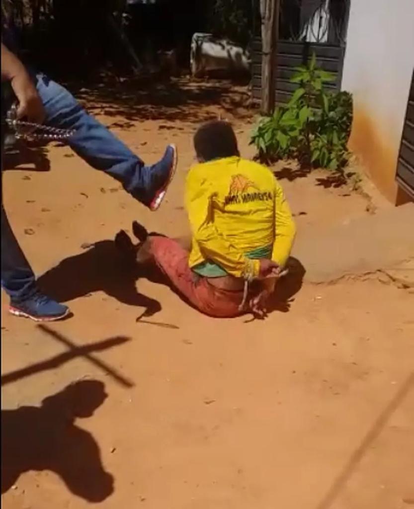 Um policial civil, de identidade não revelada, foi flagrado por populares espancando um homem preso, que estava com as mãos e pés amarrados nessa sexta-feira (4) no Povoado Passagem de Santo Antônio, em Nazária.