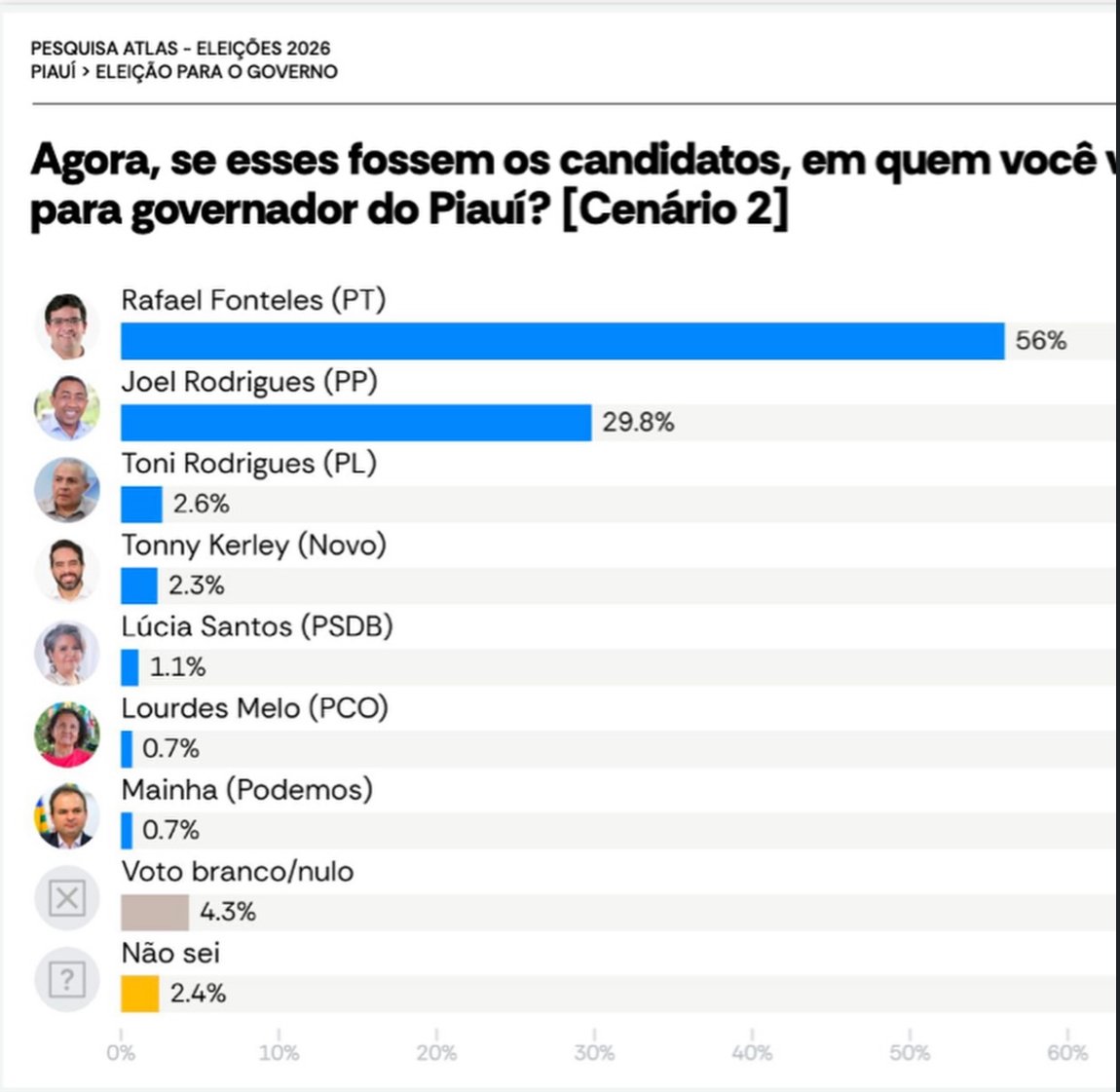 A mais recente pesquisa do instituto Atlas Intel, registrada no TSE, revela um novo cenário político no Piauí e aponta sinais de perda de hegemonia do atual governo. O levantamento foi realizado entre os dias 11 e 15 de março de 2026, período em que o ex-prefeito Joel Rodrigues ainda não havia lançado oficialmente sua candidatura, embora já fosse testado nos cenários estimulados. Mesmo assim, Joel aparece com 29,8% das intenções de voto, consolidando-se como principal nome da oposição antes mesmo de entrar formalmente na disputa. Na liderança, o governador Rafael Fonteles registra 56%, mantendo vantagem, porém abaixo de um patamar considerado de hegemonia eleitoral. Na avaliação administrativa, o levantamento também aponta mudança: Rafael tem hoje cerca de 60% de aprovação, número ainda positivo, mas distante dos 80% já registrados anteriormente. Os dados indicam um novo momento político no estado, com redução da aprovação do governador, crescimento antecipado da oposição e um cenário eleitoral mais competitivo. O fato de a pesquisa ter sido concluída antes do lançamento oficial de Joel Rodrigues reforça a leitura de que a mudança no eleitorado já está em curso, mesmo antes do início formal da disputa.