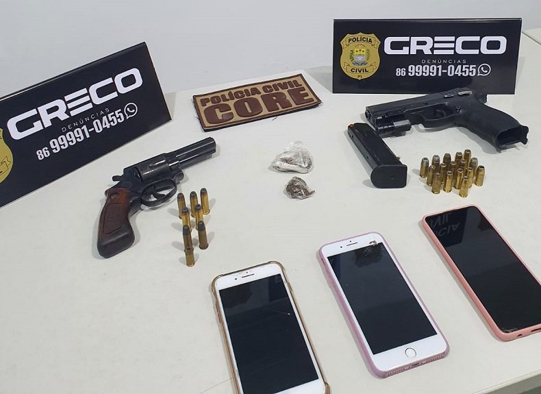 Com ele foram apreendidas duas armas de fogo, além de além de munições e porções de maconha. O que chamou a atenção dos policiais é que uma delas era uma pistola da Polícia Militar do Piauí com mira laser. A outra arma era um revólver calibre 38.