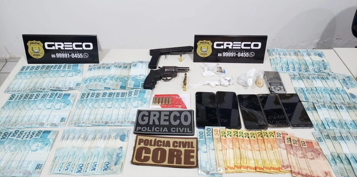 Durante as buscas, foram encontrados munições e duas armas de fogo,sendo um revólver e uma arma caseira. Os entorpecentes, as armas e o dinheiro foram apreendidos.