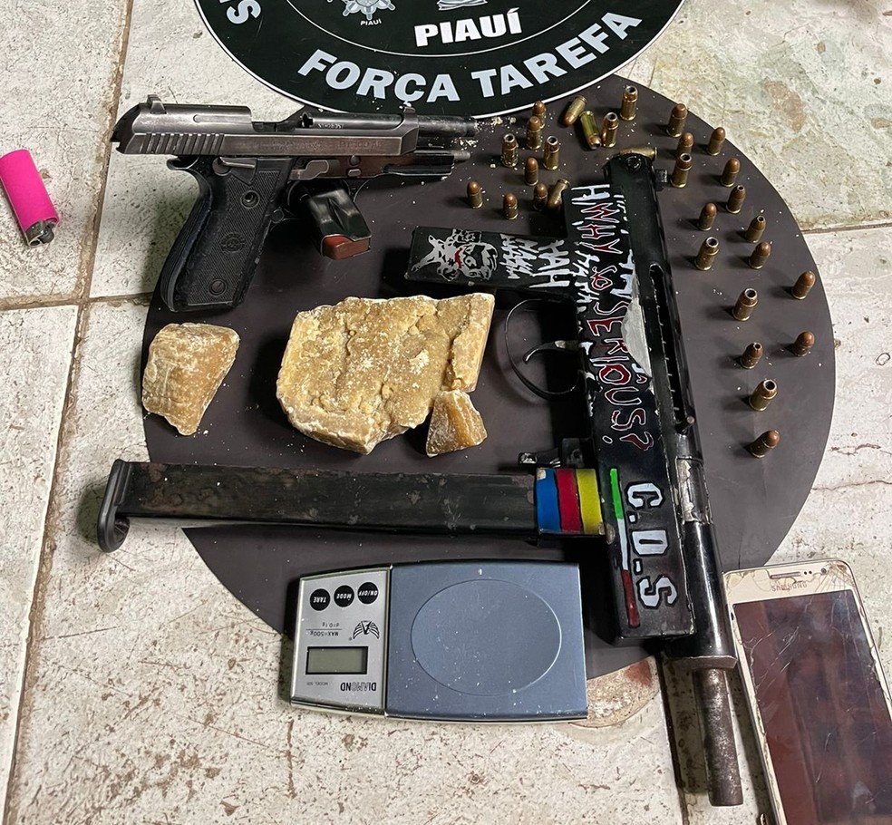 De acordo com a Força Tarefa da Secretaria de Segurança Pública (SSP-PI), com os dois foram encontrados uma submetralhadora de fabricação caseira, uma pistola .40, munições e drogas, material que foi apreendido.