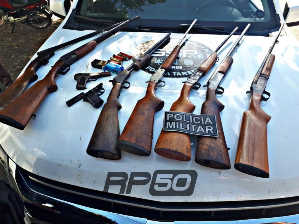 Nove armas foram apreendidas, sendo duas pistolas, rifles e espingardas de calibres variados. Os presos estavam transportando munições e o armamento quando foram interceptados na PI 115. Os homens relataram que não são proprietários do arsenal, que estariam apenas trabalhando na limpeza e manutenção das armas.