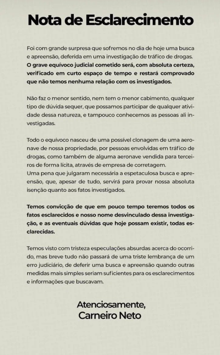 Na nota, o empresário afirma que houve um “grande equívoco judicial” e chamou a operação de “espetaculosa”, além de enfatizar não ter nenhuma relação com os investigados e que a operação servirá como prova da inocência e isenção quanto aos fatos investigados.