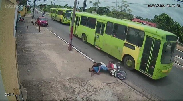 Viralizou nas redes sociais um vídeo que flagrou o momento em que um ônibus derruba dois suspeitos de assalto de uma motocicleta no bairro Angelim, Zona Sul de Teresina. A reação e tentativa de evitar a fuga dos suspeitos ocorreu nesta última sexta-feira (29).