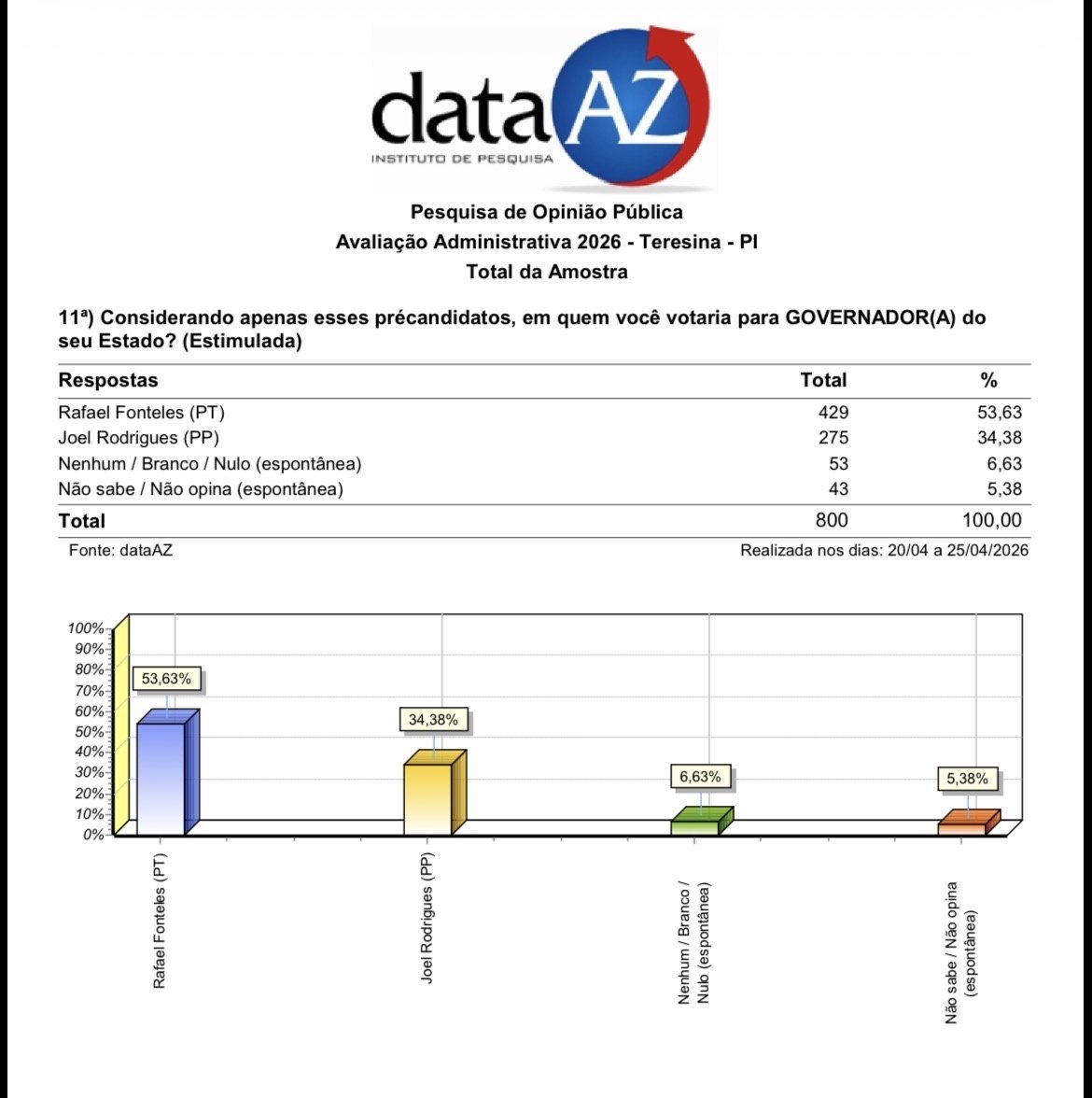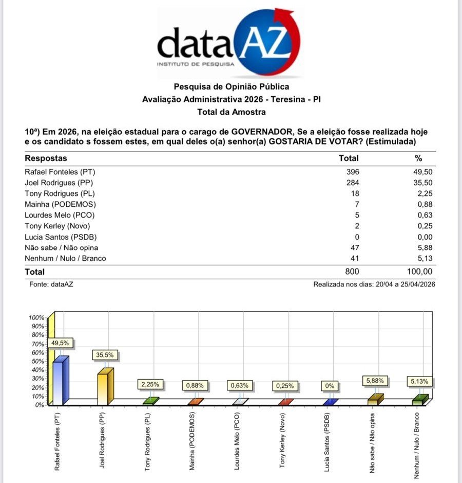 Levantamento do Instituto Data AZ realizado em Teresina entre os dias 20 e 25 de abril de 2026 aponta avanço do ex-prefeito Joel Rodrigues (Progressistas) no cenário eleitoral e redução da diferença em relação ao governador Rafael Fonteles (PT), que ainda aparece na liderança da disputa.